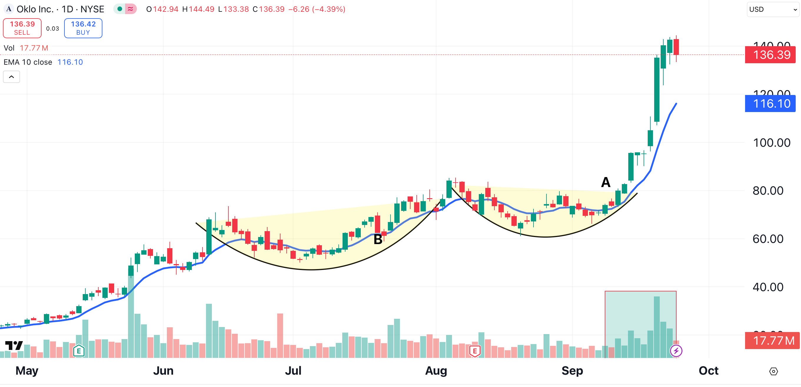 Oklo Inc. (OKLO) , a Santa Clara-based provider of nuclear power plants, fell by about 8% on Wednesday after closing at an all-time high on Tuesday. Oklo will need a deeper pullback to reach its 10-day EMA, which is currently located near $116.