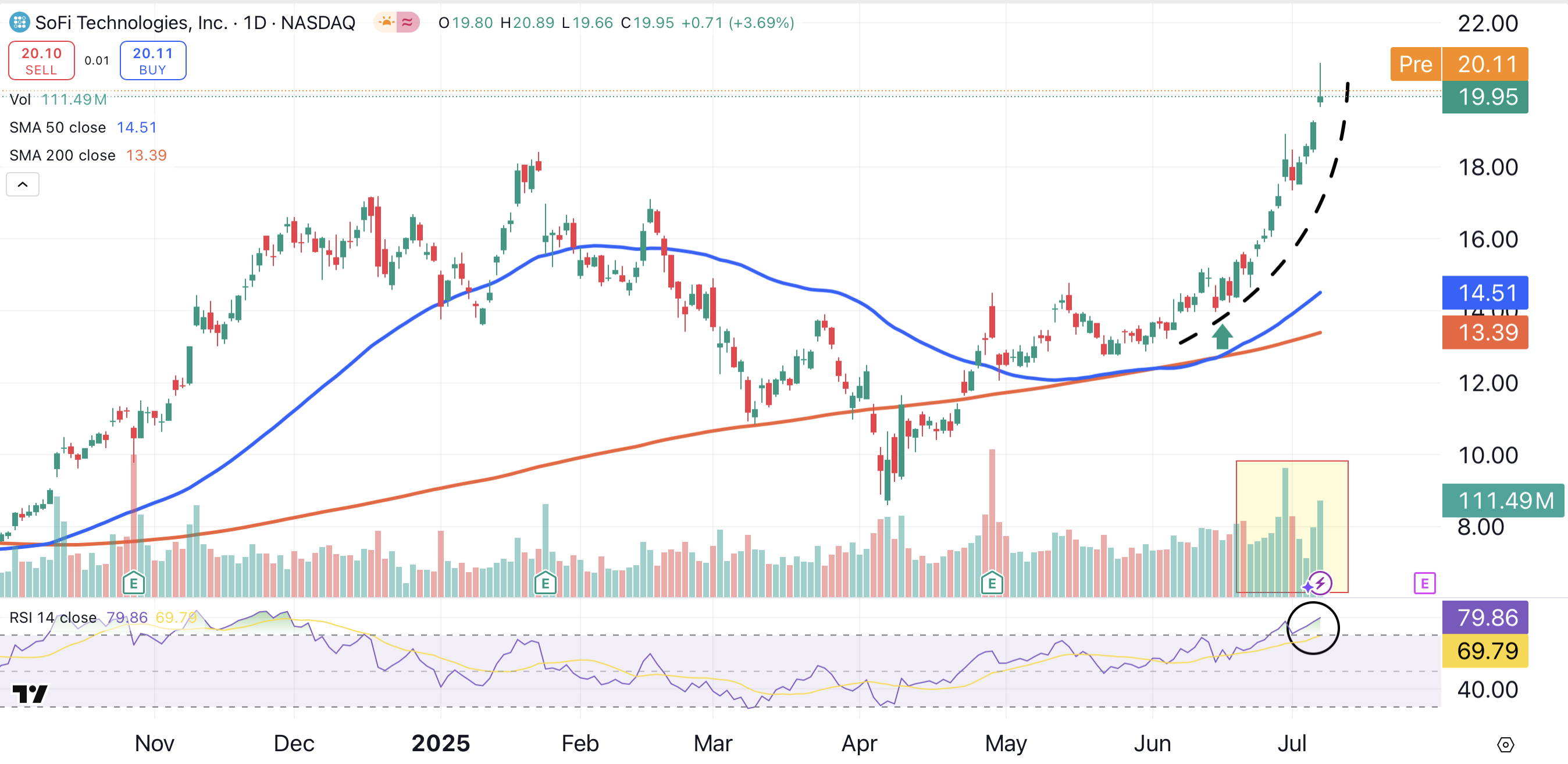 First is the accelerating arc (black dotted line) that reveals SoFi’s current trajectory. Some traders refer to this as a "parabolic curve," and it’s indicative of strong bullish momentum. The curve begins near our June 13 buy recommendation (green arrow).