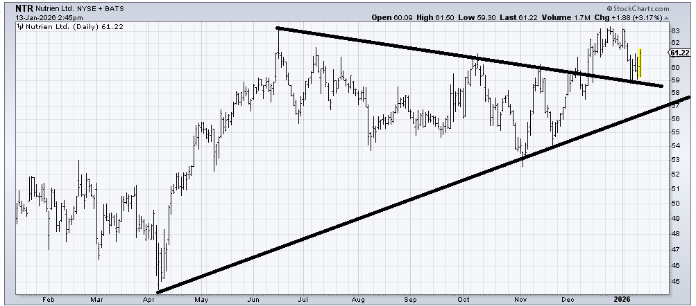 I have liked the chart of Nutrien (NTR) for what seems like forever. And while it’s been generally ok, it has lagged and for the last six months has mostly been a big fat nothing. Yet I still think there is a base there but if you are looking for something that looks imminent and dying to get started, I don’t think NTR is it. It is the epitome of slow money.