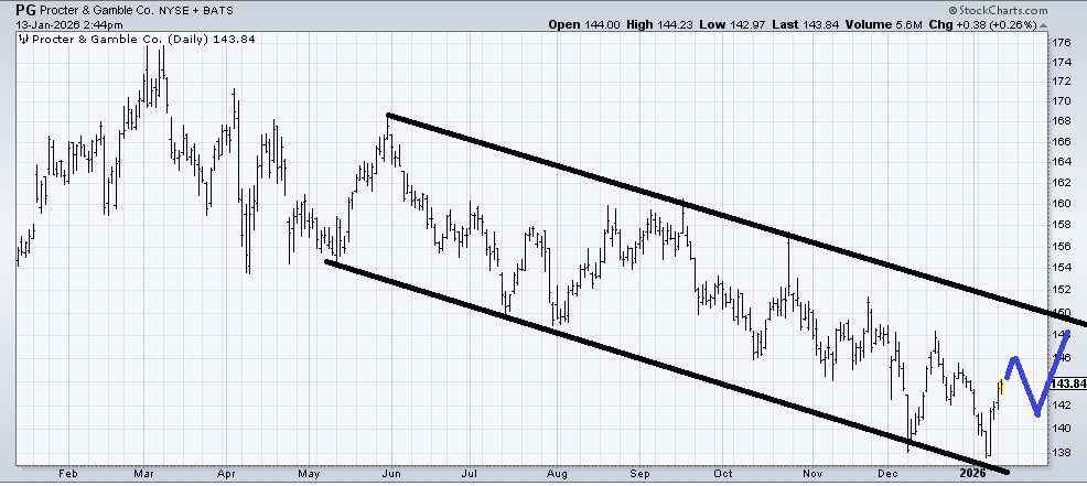 We’ve looked at Procter and Gamble (PG) several times in the last month or so using a channel like this, looking for a bounce off the lower line (we got it). There is just so much resistance overhead that it is hard for me to get excited about it. If it starts to map out something like I have drawn in blue, I might warm up to it more.