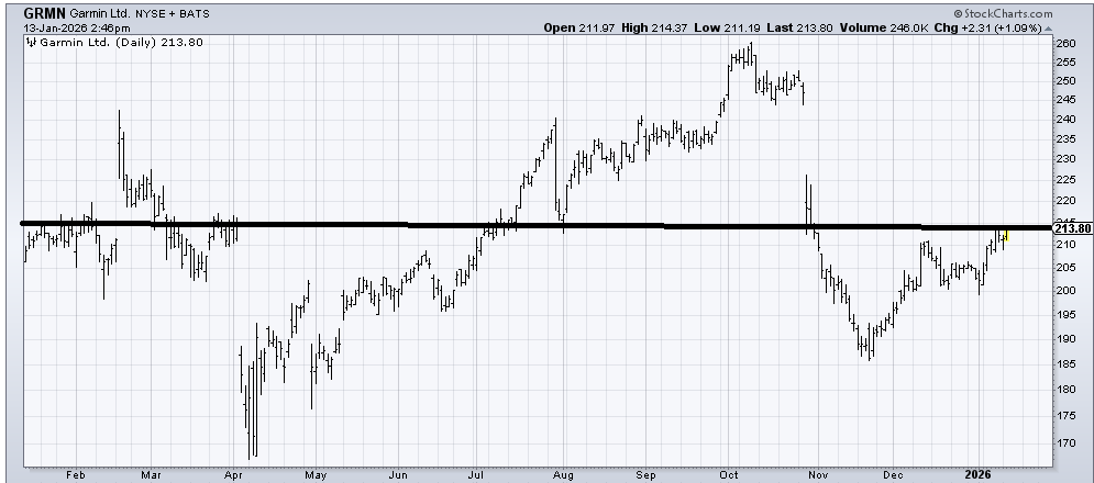 I would love to see Garmin (GRMN) get up and over 215. If the market was oversold, I’d think, okay, give it a try, but we are not oversold, so I’d be inclined to wait for it to get up and over that resistance. If the chart is still sloshing around under 215 by the time we get back to an oversold condition, then I’d probably be more excited over it.