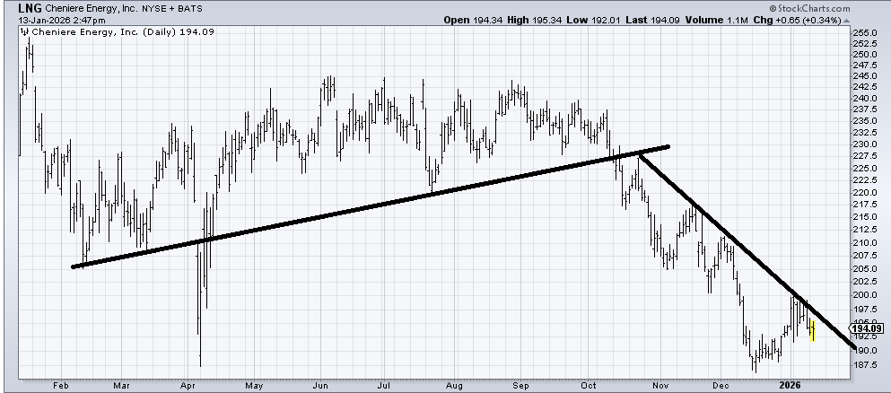 Cheniere Energy (LNG) has met its downside target. It hasn’t done a lot of work down here, but I think it can cross that downtrend line to start the process. The first thing it would need to do after that is get over 200 (a higher high). I like it as a bottom fish.