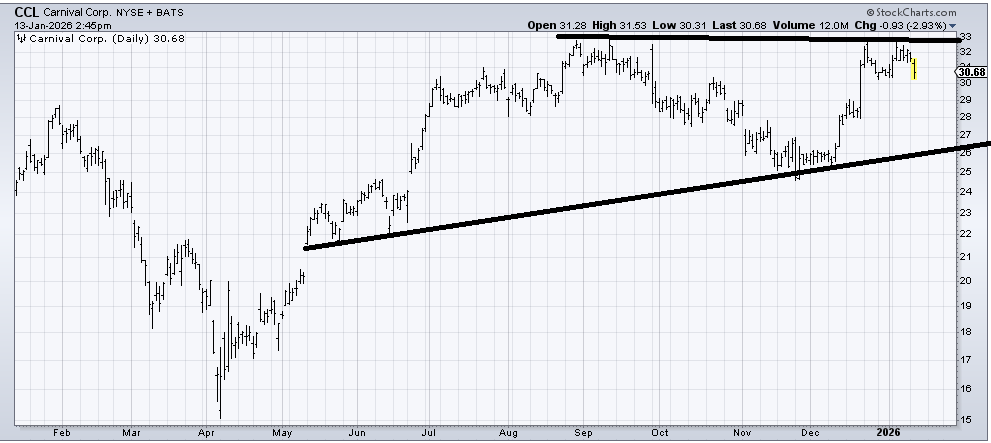 We had a nice trade in the cruise stocks last fall, but now Carnival (CCL) got to resistance and looks vulnerable to another setback.