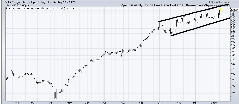 Procter and Gamble has a downward channel and Seagate (STX) has an upward one. For the time being, I would trade the channel. So unless/until something breaks on either side of the channel, that’s the way to play it.