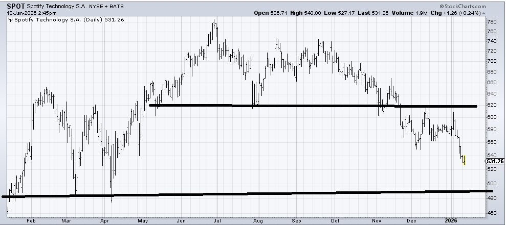 Spotify (SPOT) has a measured target in the 500-520 area, but thus far shows no sign of holding. Let’s see what it looks like if/when it gets down there. Maybe there will be a spike low/cleanout that looks tradeable.