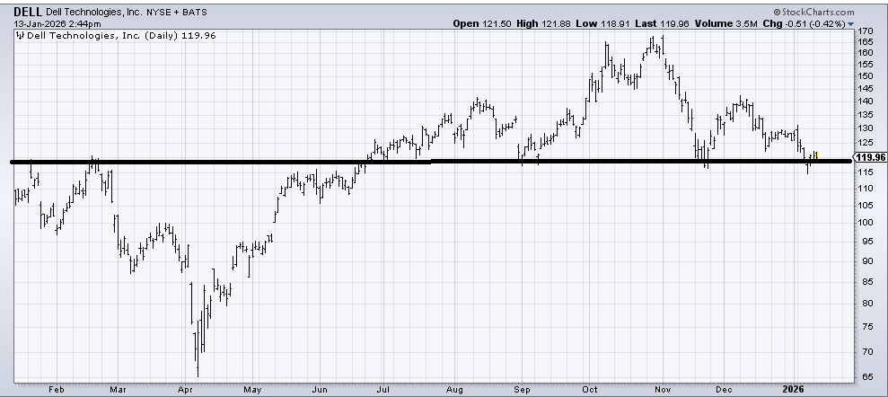 Dell Technologies (DELL) hasn’t broken down, but if it does, it completes a head and shoulders top. That 115 level is important.
