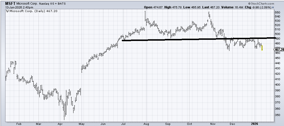 My rule of thumb when a well-watched stock breaks a well-watched level, we look for the possibility that the breakdown is a false one. We had success with that recently with Costco. I have given Microsoft (MSFT) nearly two months to recapture that 500 area, and it has failed to do so. This top measures to the 430 area, so unless it can reverse course and recapture 500 in a hurry, that would be the measured target over time.