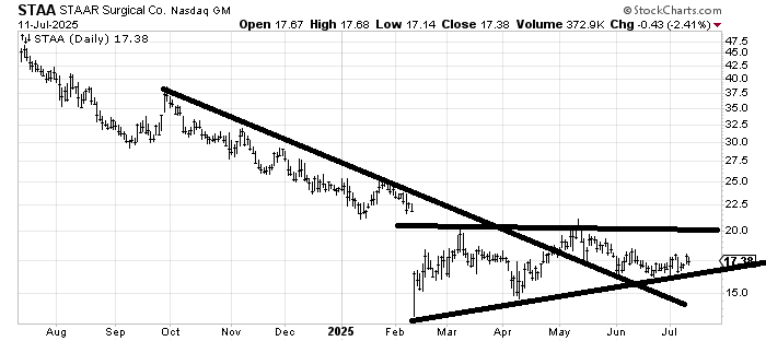 I am intrigued by STAAR Surgical STAA because it has been trying to build a base for five months now. Also, the risk/reward isn’t bad down here because under 16, and you know you’re wrong. It probably takes longer than you have patience for, though!