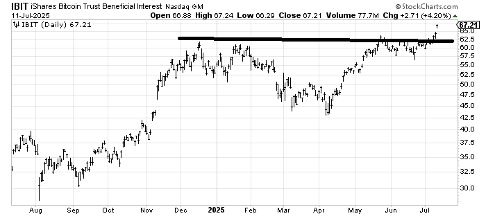 That’s a nice breakout in IBIT, the iShares Bitcoin Trust ETF. It has a short-term target right around here (67-69), so it’s hard for me to chase it. A pullback to the line would be helpful.