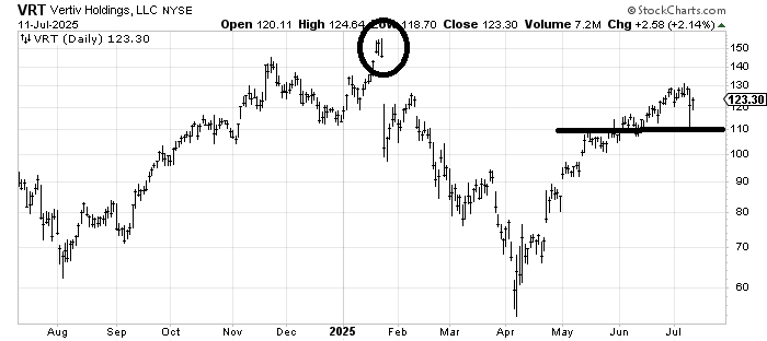 Vertiv VRT is an interesting chart because it had that island in January (circle), and yet this rally off the lows could not fill the gap. It’s not my kind of chart, so I’ll just say that as long as it stays over 110, it gets the benefit of the doubt to fill that gap from January. If it breaks 110, I’d have to look at a move down near 90.