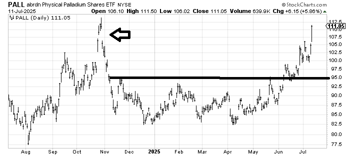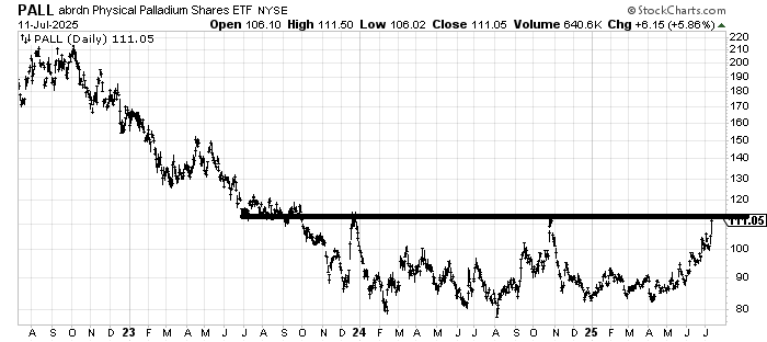 The chart of PALL, abrdn Physical Palladium Shares ETF, that I recommended a few months ago, finally got up to that gap fill and my target area. What’s more? CNBC finally noticed it! I’d be in favor of taking a little something off the table.