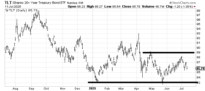 I thought TLT ought to get to 89 on that recent run, and it only got to 88, which means that’s a lower high. So I have put bonds on my list for a potential change. We’ve got the CPI out this week, so I want you too to pay attention to interest rates.