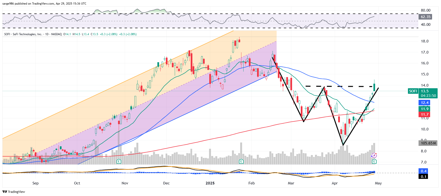 The double-bottom pattern of reversal that we had shown readers a couple of weeks back has now fully developed. The shares are trying to break out past the $13.90 pivot on Tuesday morning and have struggled to hold that level. That said, the stock has retaken its 200-day SMA, 21-day EMA and now, its 50-day SMA in succession.