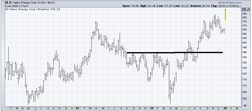 I recommended Valero (VLO) months ago, around 135, so the question is where does it measures to and is it buyable now? I am a terrible chaser, so I looked at the weekly chart. I have a measured target in the 190-200 area, so for now, I’m just a holder, not much interested in adding to it.
