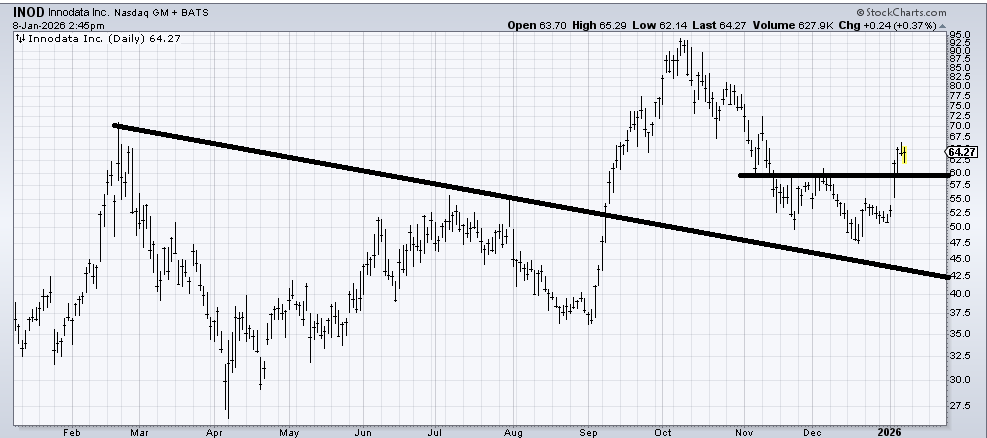 Innodata (INOD) has a measured target around 70. I’m just not sure if it pulls back to 60 first and then makes a run toward 70. If it does pull back to 60, I’d buy it with a tight stop.