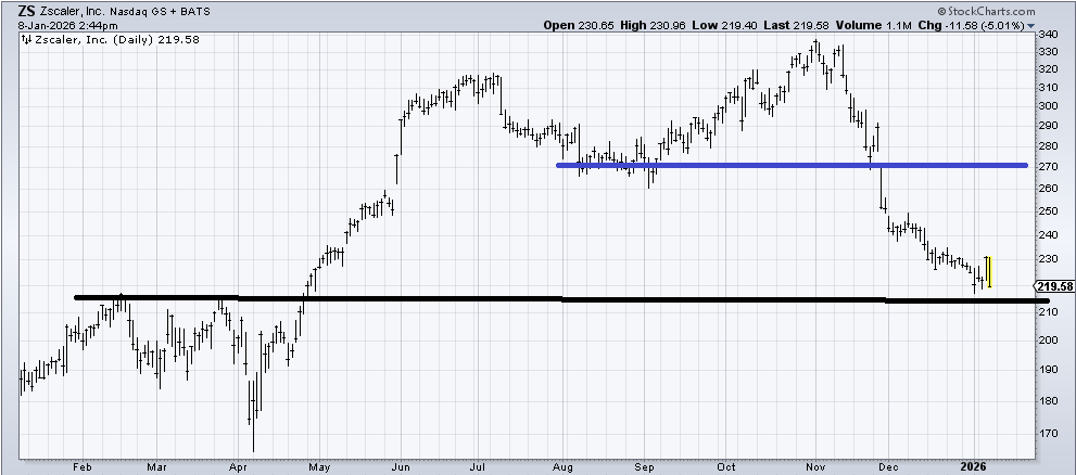 Zscaler (ZS) broke down from a double top (blue line), which measured to that 220 area it has been hovering in. I am inclined to think it’s early, but it should start to hold in this 210-220 area.