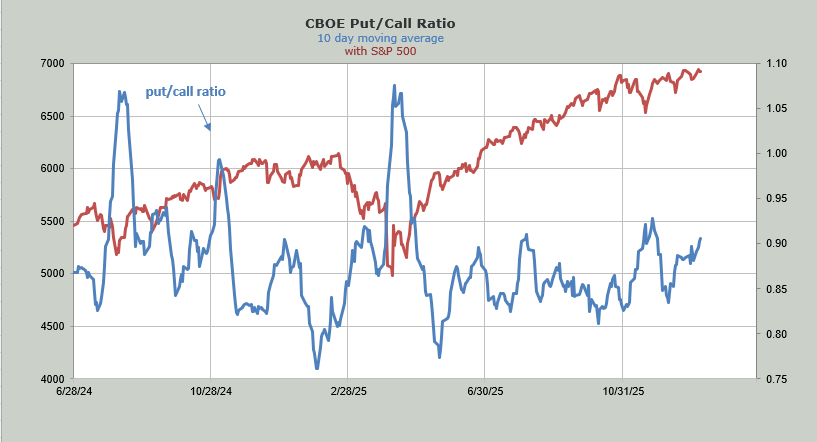 The 10-day moving average of the put/call ratio is worth focusing on. The market has rallied quite a bit from the last time the moving average was this high. In other words, the options folks are not buying calls as they usually would, and the moving average has not made a lower low since September. My experience is that this sort of action tends to precede volatility. Not always, but often.