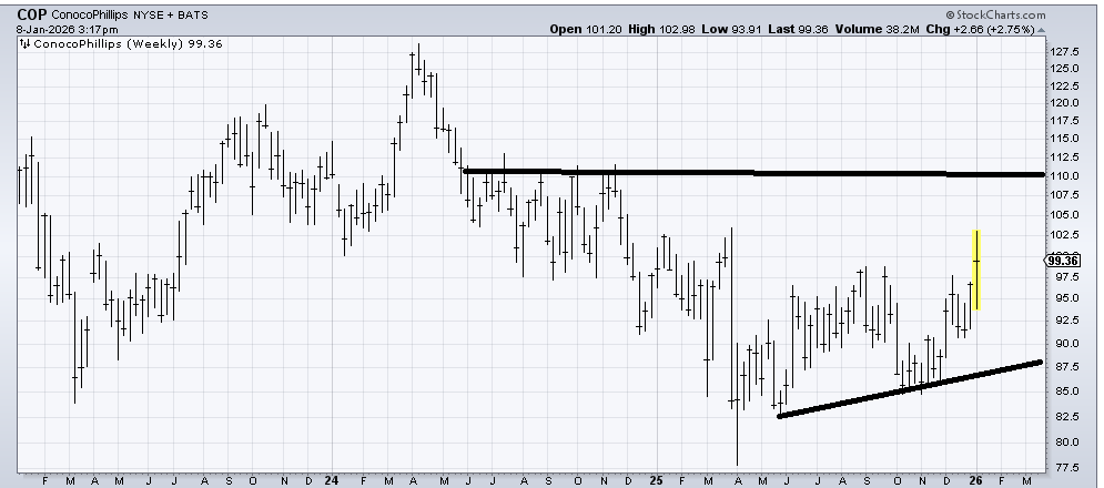 So I looked at the weekly chart of ConocoPhillips (COP) , and that seems to have more room to move. I just don’t have a good spot for a stop, but at least this one doesn’t have a feeling of chasing.