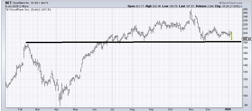 Cloudflare ( (NET) ) looks like a top, so it had better hold 180. If it breaks, the measured target is that gap fill in the 120-130 area.
