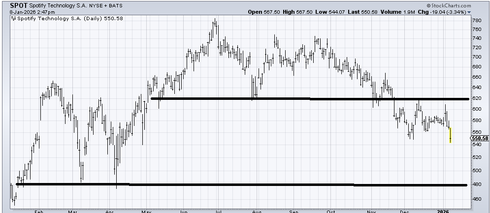 I believe the last time we looked at Spotify (SPOT) , I said I thought it could rally, but if it couldn’t get over 620, it would be bearish. That top measures down to the 490-510 area.