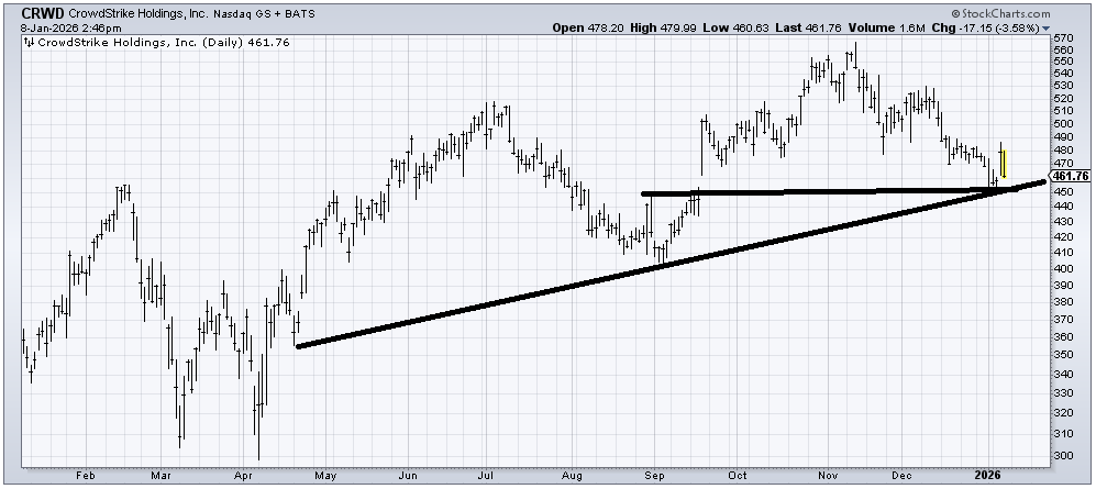 Crowdstrike (CRWD) has some decent support here. My confidence that it will hold over 450 isn’t high, though, so I’d use that as a stop area.