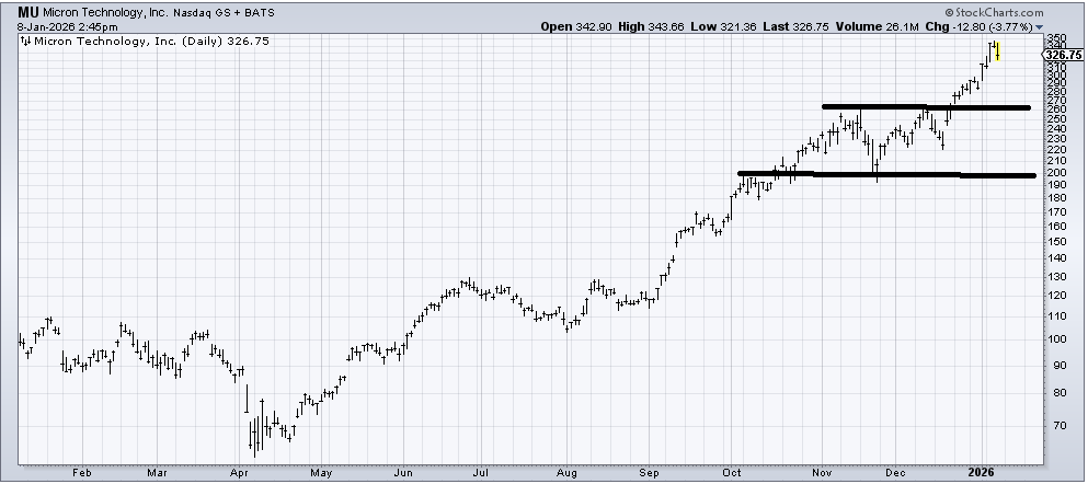 Micron (MU) is over-extended and has given back the entire rally it enjoyed on Tuesday. It has also met its measured target off that consolidation from the fourth quarter. The support is all the way back at 260, with some light support at 290. On a trading basis, I’d take some profits, but it hasn’t done anything wrong in the big picture.