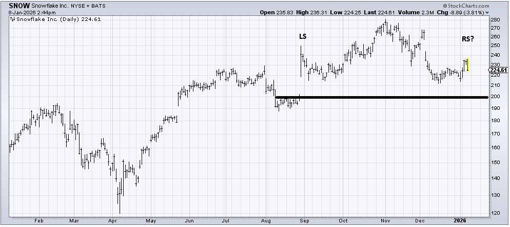 I really wanted Snowflake (SNOW) to fill that gap at 200 after it collapsed on earnings, but it refused to do it and instead rallied, and now looks like it has a head and shoulders top. If it breaks 210, it measures quite far down, like to 150—gulp. So, for now, let’s just say a break of 210 gives us a gap fill around 200. Keep in mind it has that island overhead that I highlighted back in early December, so if it can’t bounce, it’s bearish.