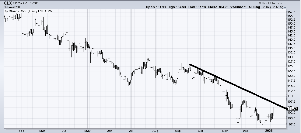 Then there is Clorox (CLX) , which we looked at just prior to my time off because it was yielding so much and was so oversold, I suggested it for a trade. That’s a big move we’ve had in the last few weeks, and the stock has decent resistance in this 107 area. I think selling some is a good idea, just to book some portion of the profit.