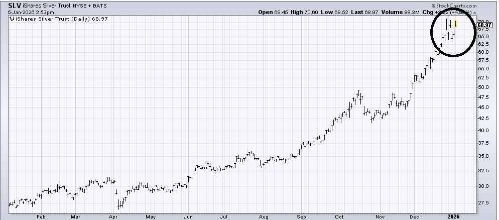 Before I left on vacation, I said I thought the metals were due for a pullback and that maybe my timing wouldn’t be great, but with the DSI on Silver at 89, it was enough for me. Since then, it has gapped down, gapped up, gapped down, and gapped up, rendering the chart of SLV the same price it was when I said that. I still feel that way. There will come a time when this sets up better. I just don’t see it now.
