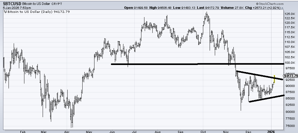 With the caveat that I am a Bitcoin skeptic, I have not changed my view on it. I said in late November it was a buy because the DSI had gotten to 13 and the chatter was extreme. BTC was 83,000 at the time. If it can get over 95,000, then the next stop is 100k.