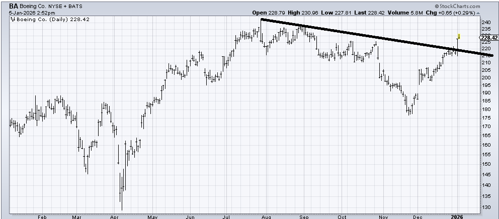 Boeing (BA) would be good if it can pull back to that 215 area and test the downtrend line it broke through last week.