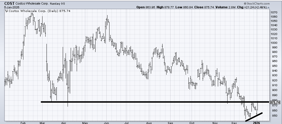 Next up is Costco (COST) , which I have had several inquiries on. I still think it is trying to desperately recapture that 875 area. It has tried twice and failed. I think it gets over it, but so far, it has not done so. If it trades under 840-ish, I would probably give up on it.