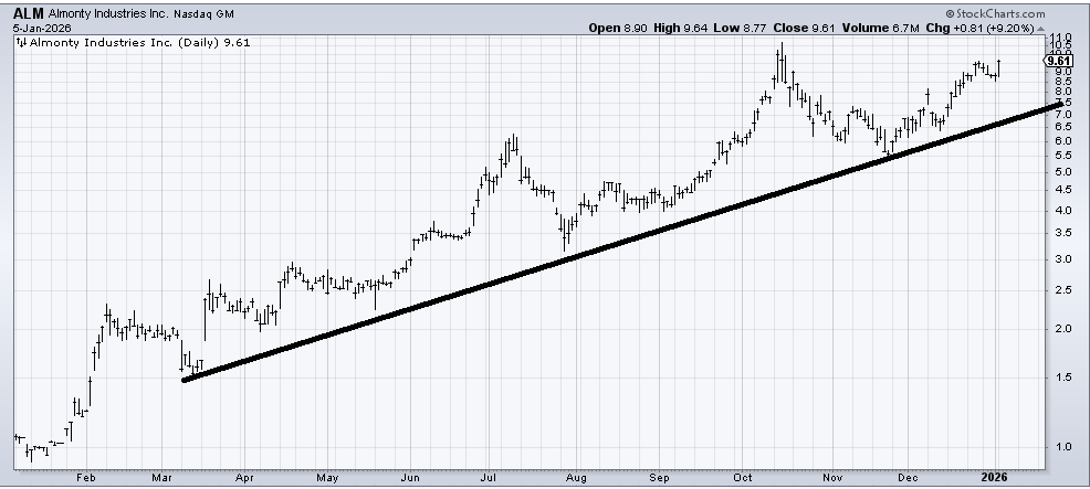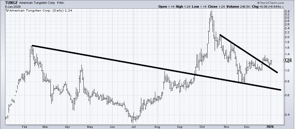 This first chart is one you should consider putting on your screen—after you say to yourself, ‘what the heck is Helene thinking?’. Keep in mind, last year when I highlighted PALL’s base, no one was thinking Palladium can have a run. Some folks might not have even known what it is used for (I am still murky on it!). But I saw a write-up on Tungsten recently that caught my eye. There is no ETF for it. There really are no charts that are US-based except for Almonty (ALM), but the chart is not really a base, although it’s a good chart.
