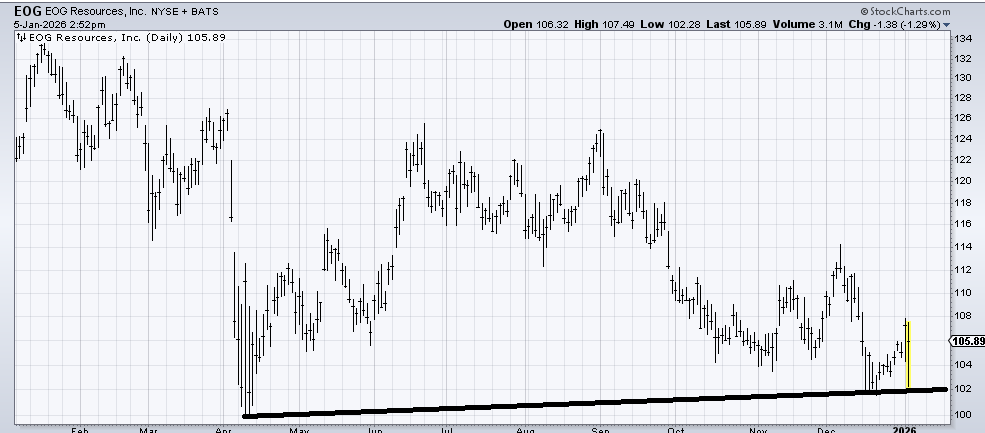 EOG Resources (EOG) is a chart I liked months ago, and I have been dead wrong about it. If it breaks 102, I’d run for the hills.