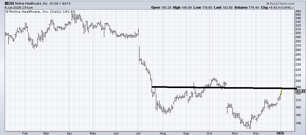 Molina Healthcare (MOH) should run into some short-term trouble in the 190-195 area. That is resistance, and a gap fill, and a measured target. But if it then pulls back toward 170-175, it would probably be buyable again.