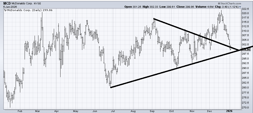 Then there is McDonald’s (MCD) , which I liked in early December. It had a nice run, and then it not only died, it collapsed. It has now been red for six straight days, which makes it oversold. I would be shocked if it doesn’t rally in the next few days from this area, but I have been dead wrong on this.
