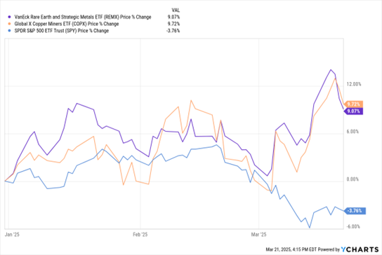 Today’s MoneyShow Chart of the Day sheds some light on the subject. It shows the year-to-date performance of the VanEck Rare Earth and Strategic Metals ETF REMX and the Global X Copper Miners ETF COPX, and how their returns compare to the SPDR S&P 500 ETF SPY. You can see that these mining ETFs are handily outperforming the S&P — up about 9% in both cases versus a drop of almost 4%.