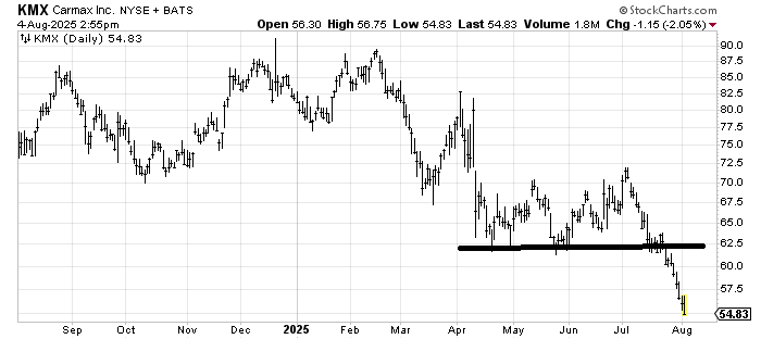 The only good news I have for KMX is that there is a measured target in the low 50s and the stock is getting mighty oversold so it is due a bounce.
