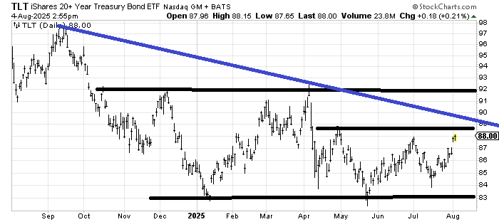I seem to have confused folks on my view regarding bonds. I still think rates will be mostly between 4 and 5%. Sometimes we will go outside of the range for a bit but mostly that’s what I see. When it comes to TLT you can see the range on the chart. 89 is going to be resistance and after that 92-ish. I do not think I have changed my view in a few years because rates have mostly been in that range for nearly three years.