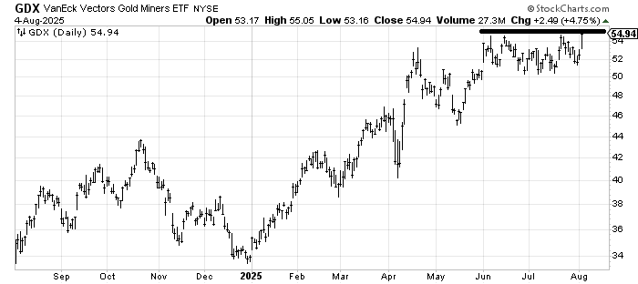 However GDX is on the verge of breaking out. Some have said the stocks lead the metal but I have never seen a great correlation. However since I was asked about GDX, let me say a breakout here would put a next measured target near 59-60.
