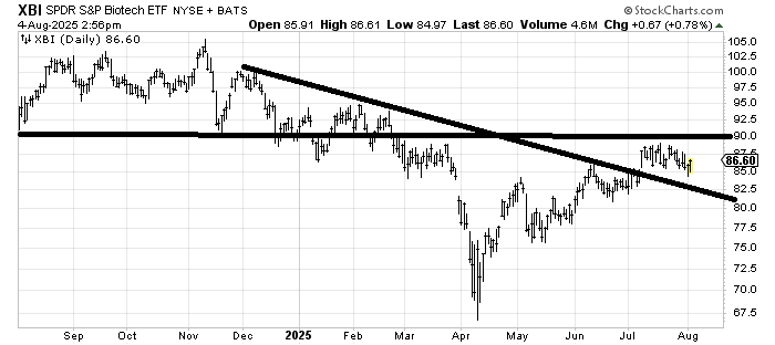 XBI is trying to chew through all that resistance. I don’t think it does so in one bite but rather over time and that probably means there will be a correction at some point. The pattern is not exciting but it’s not dire either. It feels like patience is required; the good news is the selling last week was quite contained.