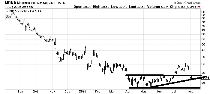 This is an important area (27-ish) for Moderna MRNA because if it can hold here it will improve the base it is trying to build. The base is still quite small and there is no clear cut breakout. I do not want to see it back down near 23 since I would not view that as bullish.