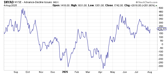The 30-day moving average of the advance/decline line is still overbought.