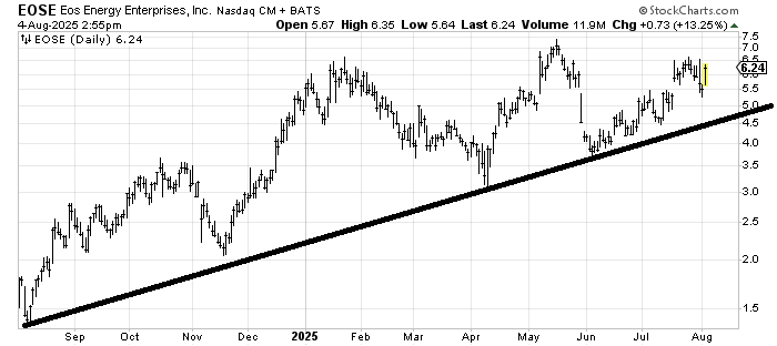 Eos Energy EOSE scares me because it has a look of a potential head and shoulders top if it can’t get through 6.50. However the trend is up and unless/until it breaks 4.50 it hasn’t done anything wrong. I actually like that it filled that gap last week