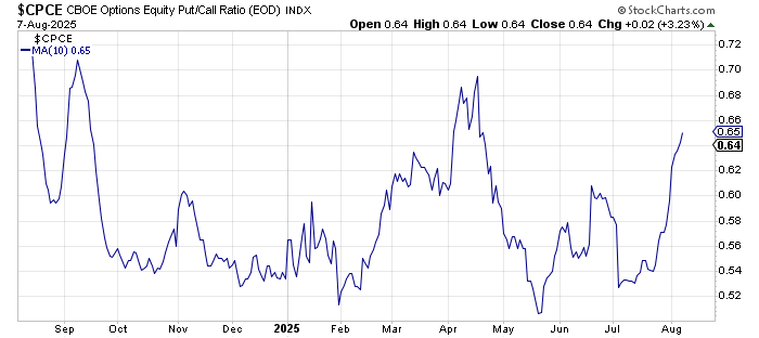 Then there is the put/call ratio. Today it came all the way down to .78, which is the lowest reading since July 18. But when we look at the 10-day moving average of the equity-only put/call ratio, we see it has already surged from .52 to .65 since early July. It is now closing in on the peak reading from April.