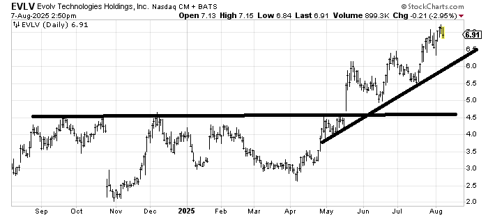 Evolve Technologies EVLV has a measured target in this 6.5-7 area but it hasn’t done anything wrong yet. If you bought it, well, you can take a few profits, but otherwise as long as it stays over that uptrend line, it should be fine.