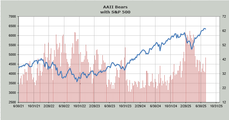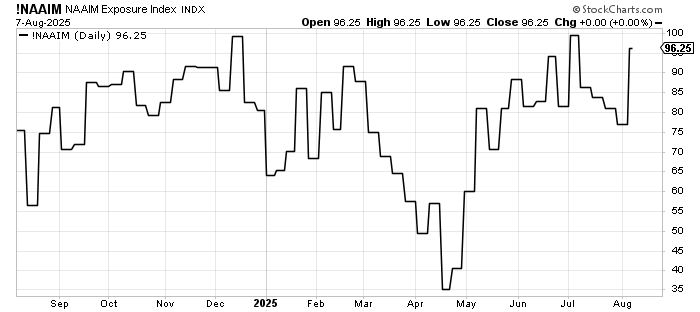 Then there is NAAIM, which got quite bullish. It is my contention that when the Mag-7-type names do well, the NAAIM folks are happy to increase their exposure. When those megacaps lag, they pare it back. They have lifted their exposure this week to 63. In early July they were kissing 100.