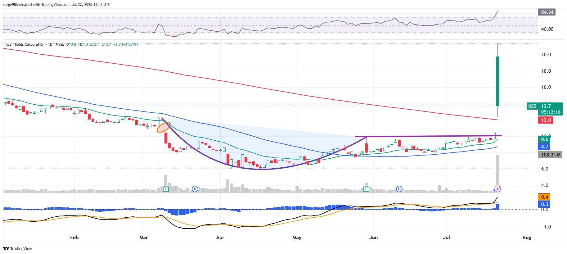 Interestingly, KSS developed a cup-with-handle (maybe a saucer with handle) pattern with a $10 pivot ​that culminated back in late May. This pivot acted as resistance until Monday, when it cracked to the upside. That may have been the technical catalyst for a flash short covering.
