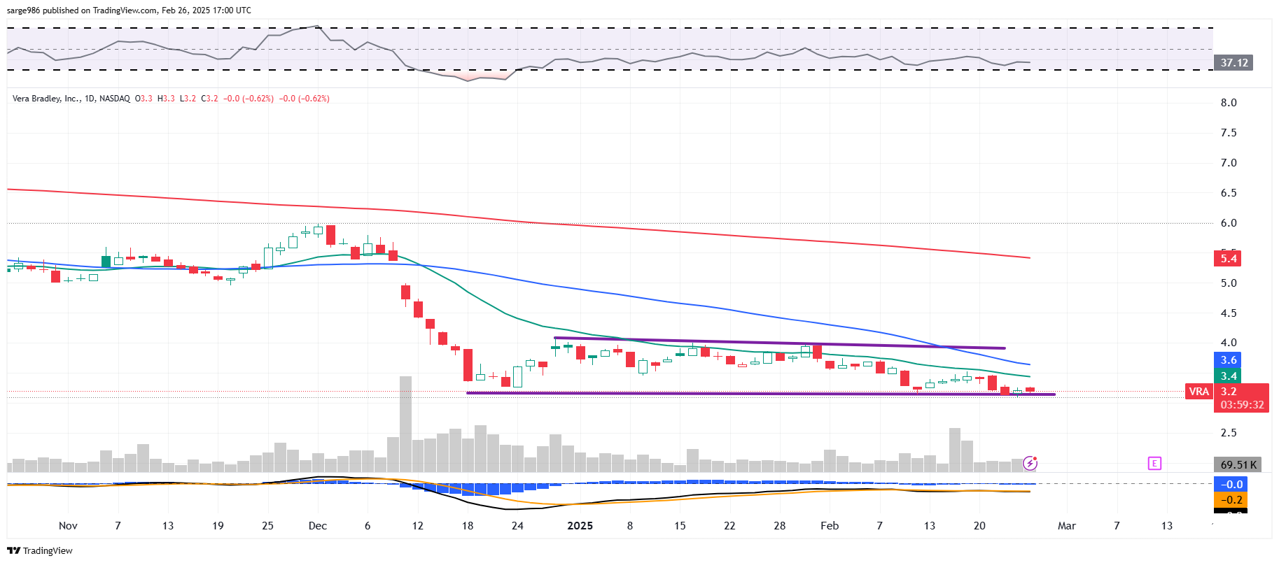 Readers will see that VRA has gone into a basing period of consolidation dating back to mid-December 2024 after that precipitous fall. The unfilled gap created on December 11 would need a tick at $5.37 or higher in order to fill. The stock currently trades toward the bottom of that base.