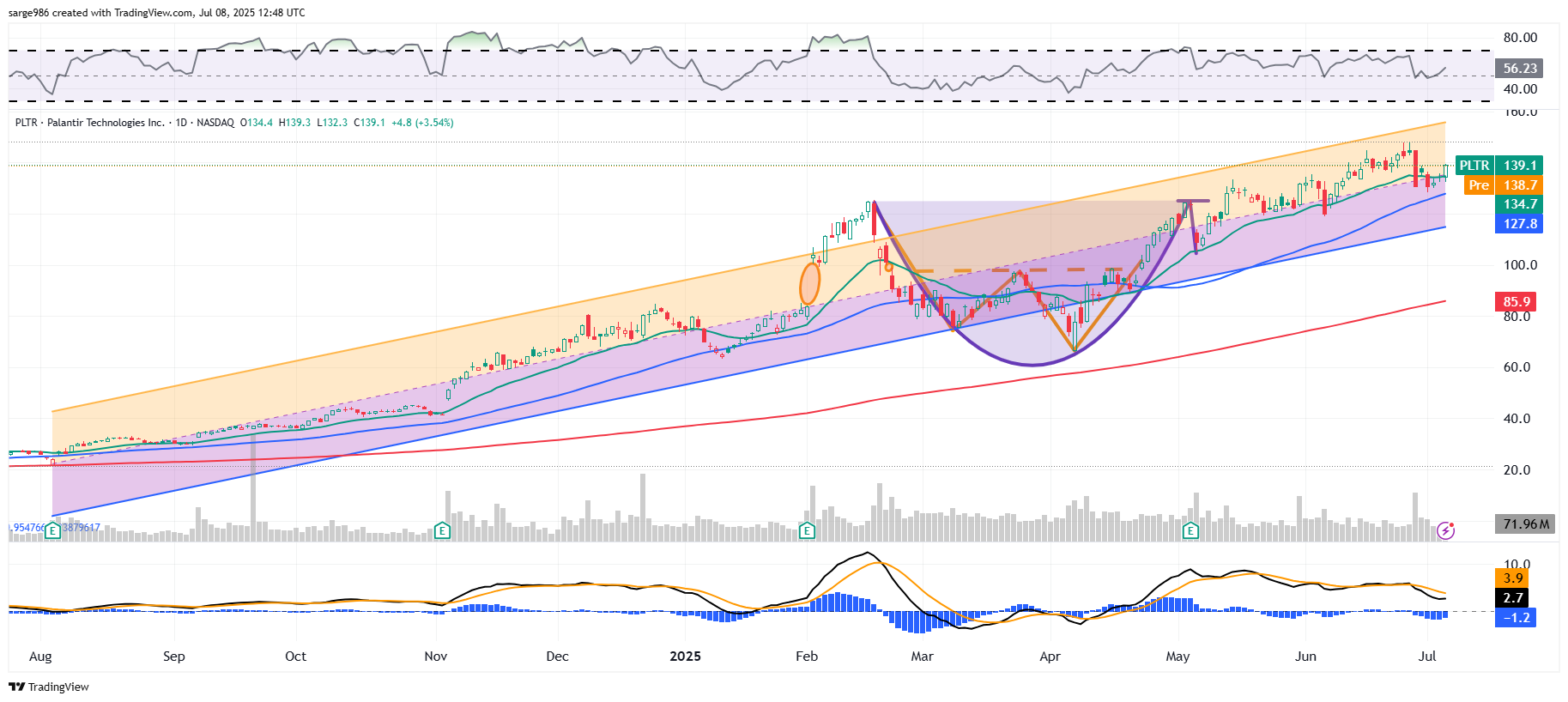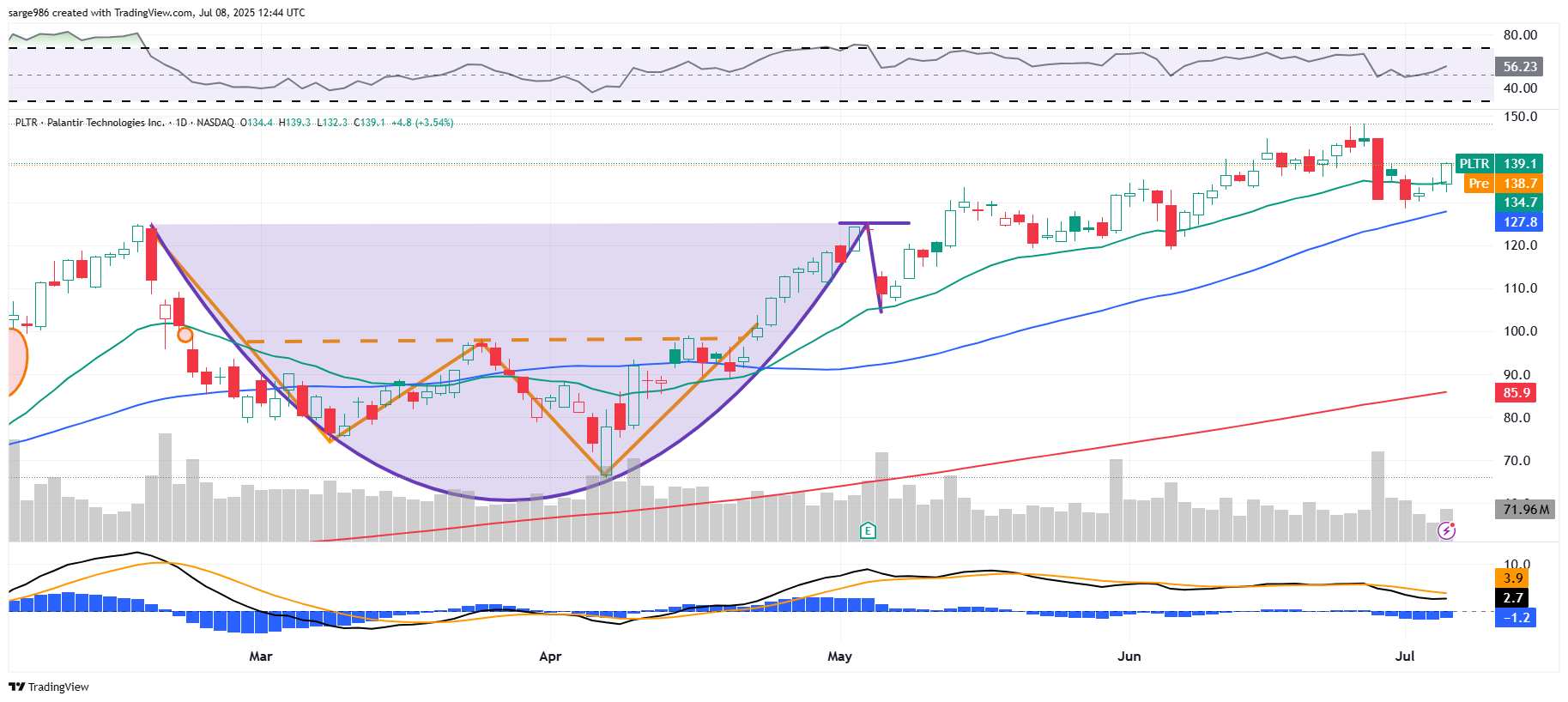 This is very similar to the chart that I showed readers on June 27. The stock continues to break out of the cup pattern that we recognized in May and then added a handle, which is a bullish signal. The stock retested its 21-day EMA with the development of that handle and passed that test with flying colors when suspected swing traders stepped up to the plate.